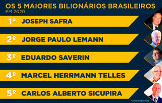 Embora as consequências econômicas da pandemia do Covid-19 este ano sejam incontáveis, a lista de bilionários brasileiros da Forbes bateu um novo recorde. São 33 novos nomes, um aumento de 16% em relação ao ano passado. Ao todo o ranking de bilionários possui 238 personalidades.