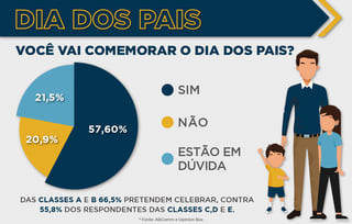 Devido o isolamento social 23,7% das pessoas, alegaram que a comemoração do Dia dos Pais, será realizada apenas por chamada de vídeo. Entretanto, outros 20,7% afirmaram que irão visitar o pai na data. Quer conferir esses e outros dados com mais detalhes? Então clique aqui e confira o infográfico da semana.